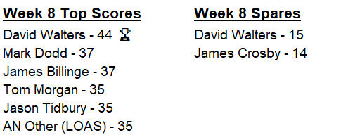 only the biggest spare this season but smacking the highest total so far with 44 pins. Mark Hoskins totalled 34 for