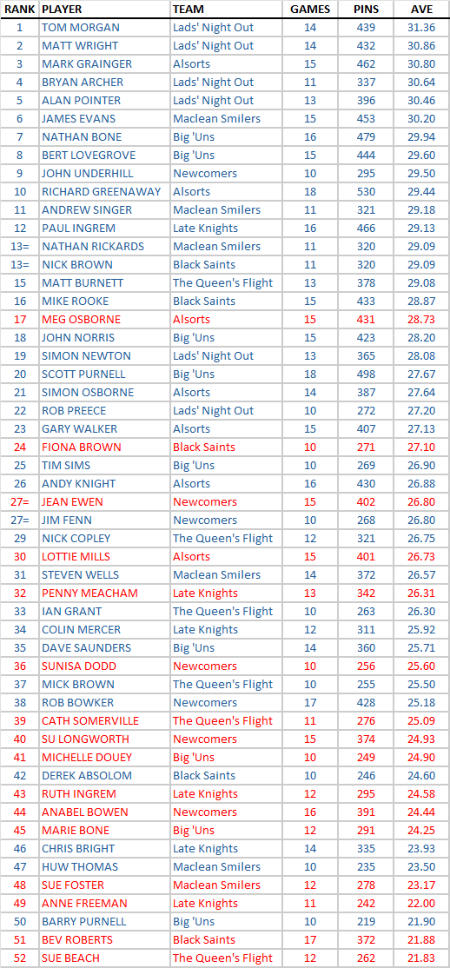 Unfortunately Division One data from this season has been (largely) lost due to the computer file being corrupted. All we can be certain of is that Ben Denton won the Men’s averages with 32.83, Carl Wood was second with 32.72 and Steve Lee third with 32.20.Winner of the Ladies’ averages was Sharon Frost with 28.71, Liz Bachelor was second with 27.67 and Heather Brown was third with 27.64