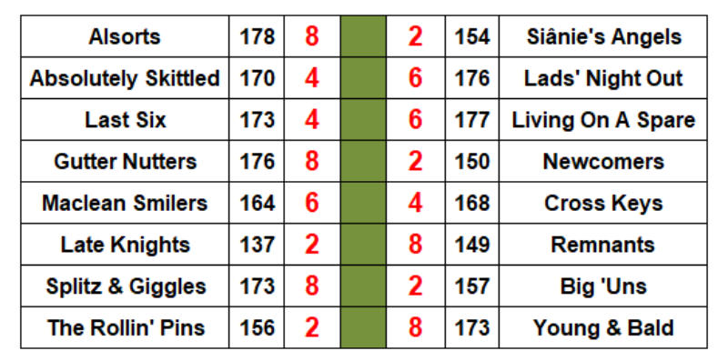 way to 40 pins and a leg win. They whacked a creditable 37 in the last, but Alsorts moved into top gear with a 45-