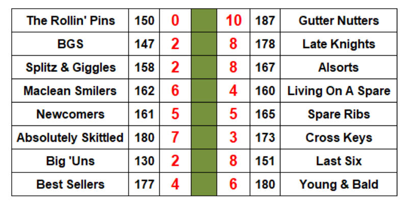 BGS and Gutter Nutters are joined on 44 points by Alsorts, who had an 8-2 win of their own against Splitz ‘n’