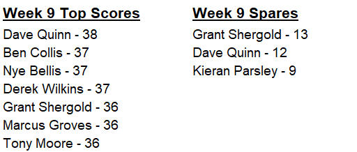 with 38 to move himself to 7th in the averages. Mark Reeves hit a new PB of 34 for Rollin’ Pins.