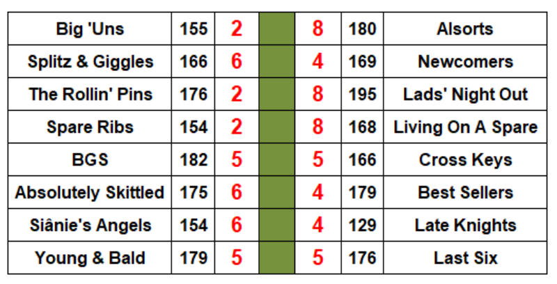 Lads’ Night Out managed the same 8-2 result against a strong Rollin’ Pins side in the highest scoring game this