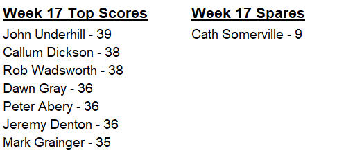 & third with 35 & 39 themselves; in the beer, Cath Somerville hit the sixth 9 spare of this season. Rob Wadsworth