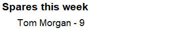 supported by Rob Preece’s 34 & Tom Morgan struck the week’s sole spare (9). Lee Crook’s 35 came close to