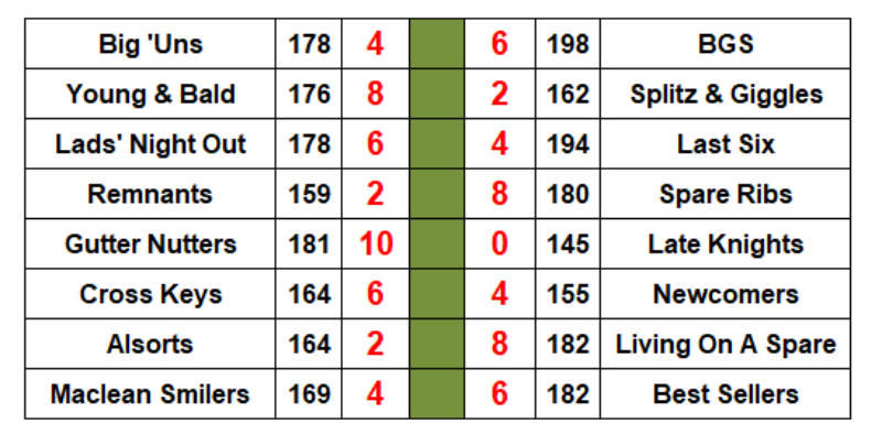 Young & Bald won big against Splitz ‘n’ Giggles (8-2), with Ben Mayo hitting a new PB of 35.