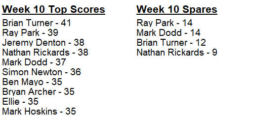 the pins by 16. Brian Turner hit a 12 spare on his way to a mighty 41, backed up by 38 from Jeremy Denton;