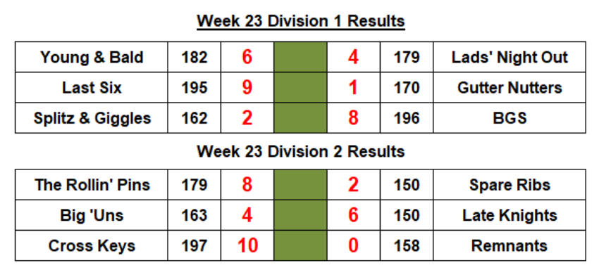 The week’s best total came in Div 2, with Cross Keys smacking 197 pins to whitewash Remnants, and stake